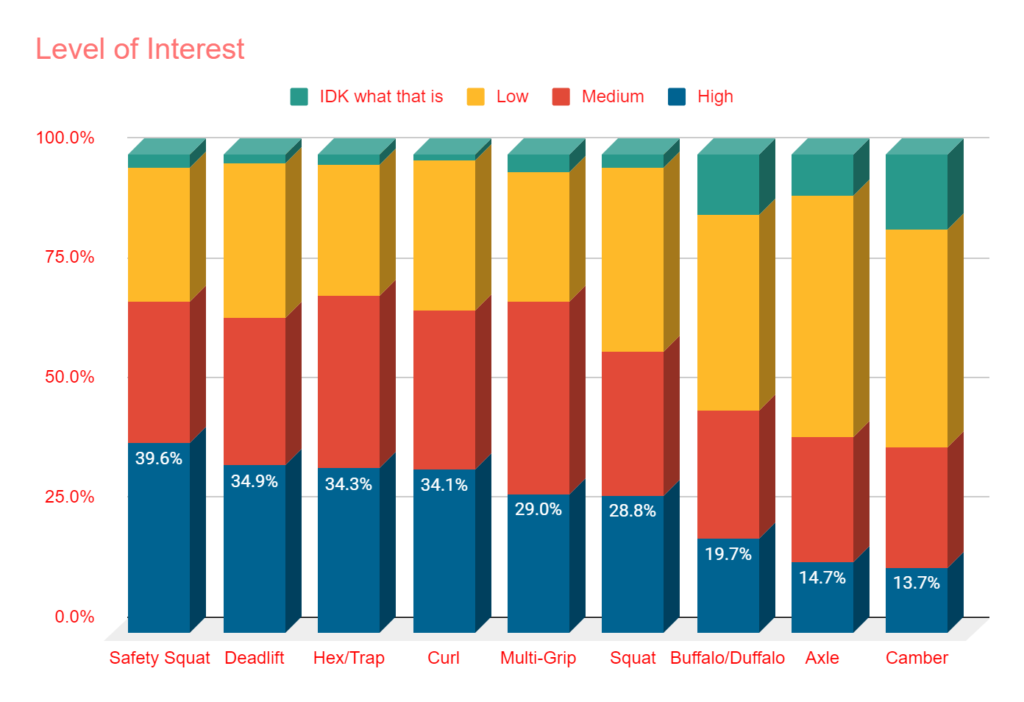 - The safety squat bar with just under 40% “high interest” votes led the way when looking at most popular “specialty bars.” The deadlift, hex, and curl bars were all between 34 and 35%.