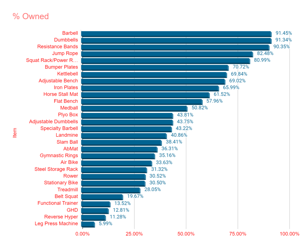 - This survey was done 6 months prior and there was a shakeup. With 91.45%, the barbell is the #1 owned item.
