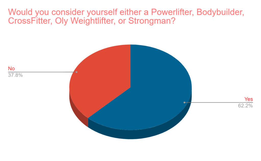 - 38% would not consider themselves a Powerlifter, Bodybuilder, CrossFitter, Oly Weightlifter, or Strongman.