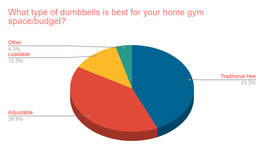 - Traditional Hex Dumbbells narrowly beat out Adjustable Dumbbells as the best option for most home gym owners with space and budget in mind. Loadable dumbbells were pretty far back compared to the top two options.