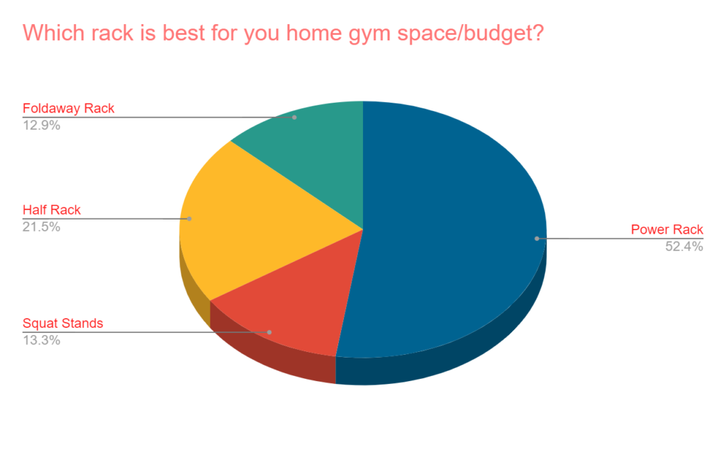 - The power rack is the most popular for most home gym owners even with space and budget in mind. Over half voted for this option.