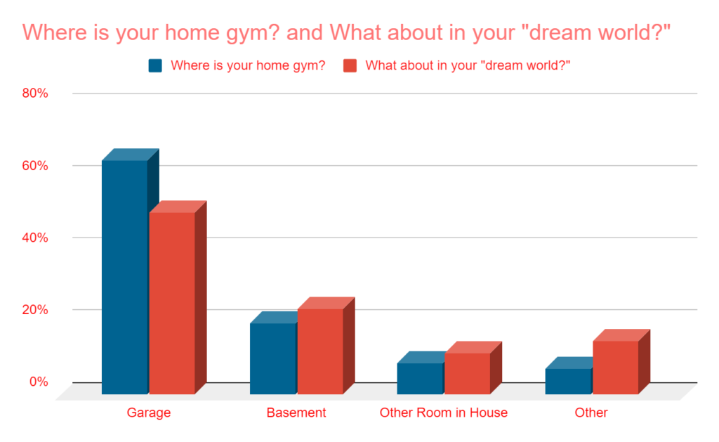 - The garage is the most popular spot for most putting in a home gym. About 2 in 3 have a “garage gym” with 20% in the basment. 9% are in another room in the house and 7% have it elsewhere. In addition, while 65% have it in their garage, only 50% say it would be in their dream world.