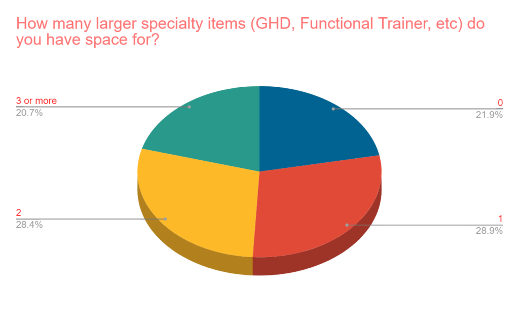 - How many larger specialty items like a GHD do you have space for? The responses for this question were spread out relatively evenly, but only 21% have room for at least three “larger specialty items,” meaning most have to be very particular when adding something like this for their home gym. 51% have room for 0 or 1.