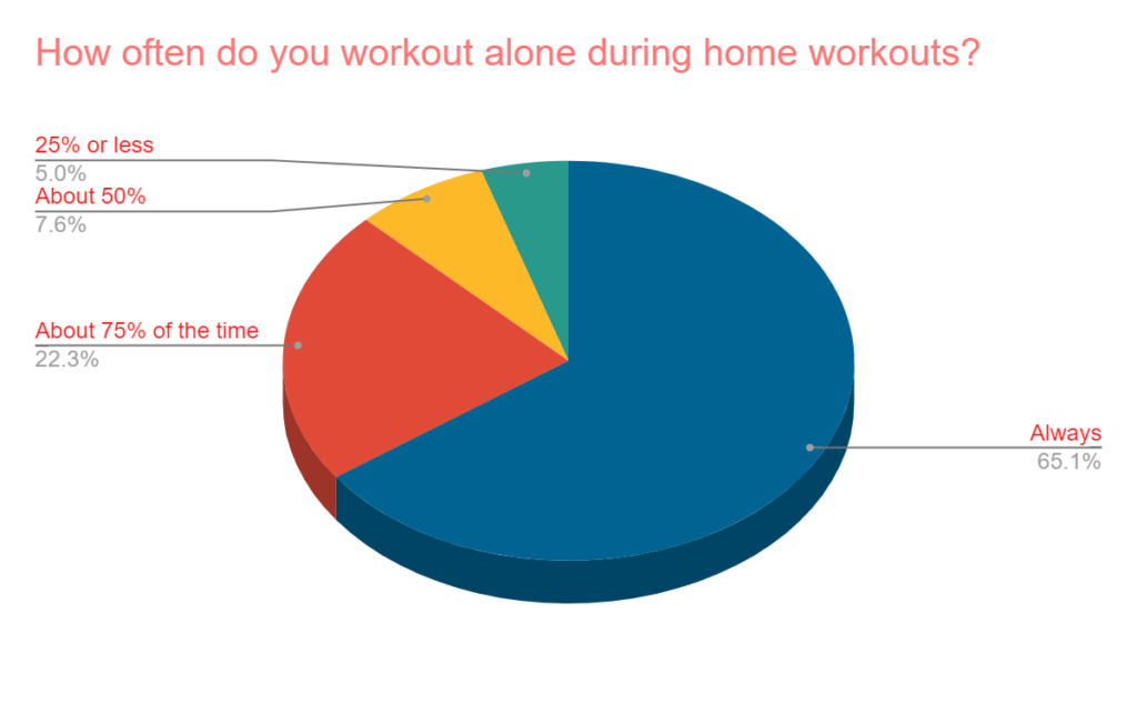 - About 2 in 3 are doing every single workout alone. Only 5% are working out with a partner at home a majority of the time.