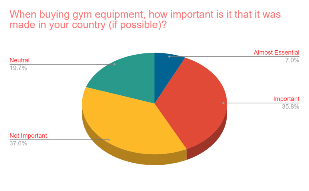 - When asked about the importance of gym equipment made in your country, nearly 38% stated that it was not important at all while a total of around 43% voted it to be at least “important” with a small portion of that saying it’s essential. About 20% did not have any feelings on the subject.