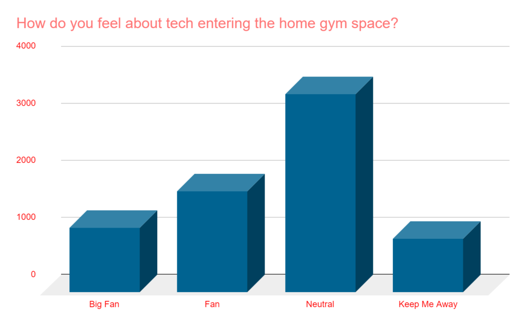 - There is no question the technology in the home gym space is going to evolve. Only 13% voted “keep me away,” while nearly 40% say they are a “fan” or “big fan.” Nearly half said they were “neutral” though.