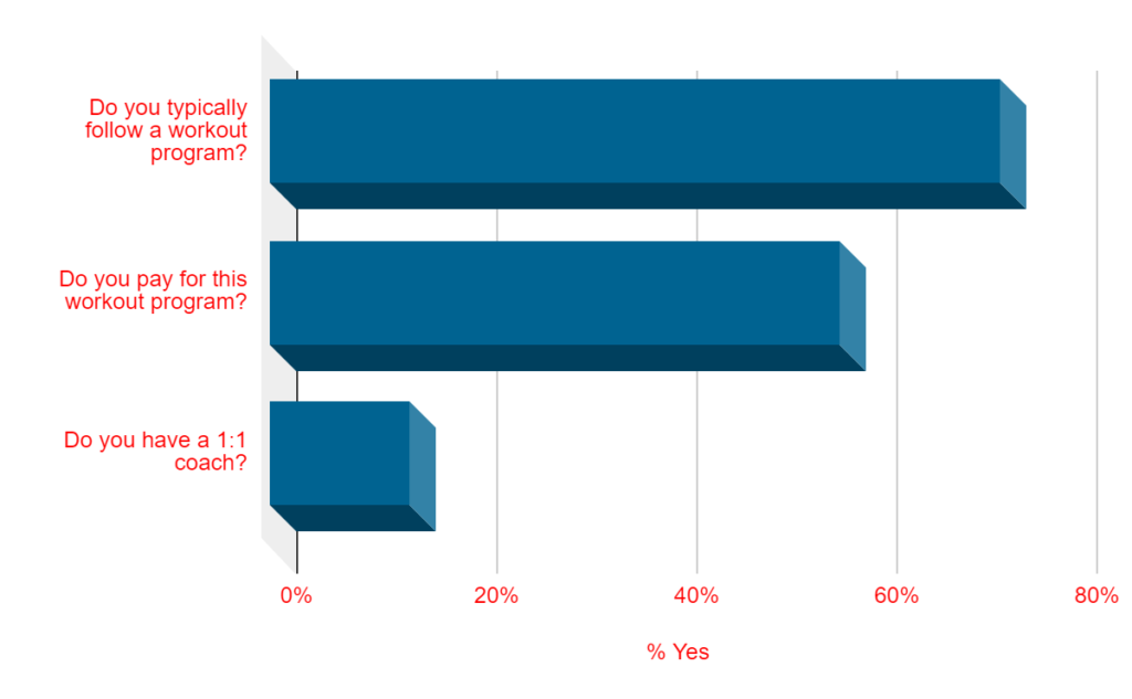 - About 73% typically follow a workout program. 57% do not pay for this workout program. Nearly 14% have a 1:1 coach.