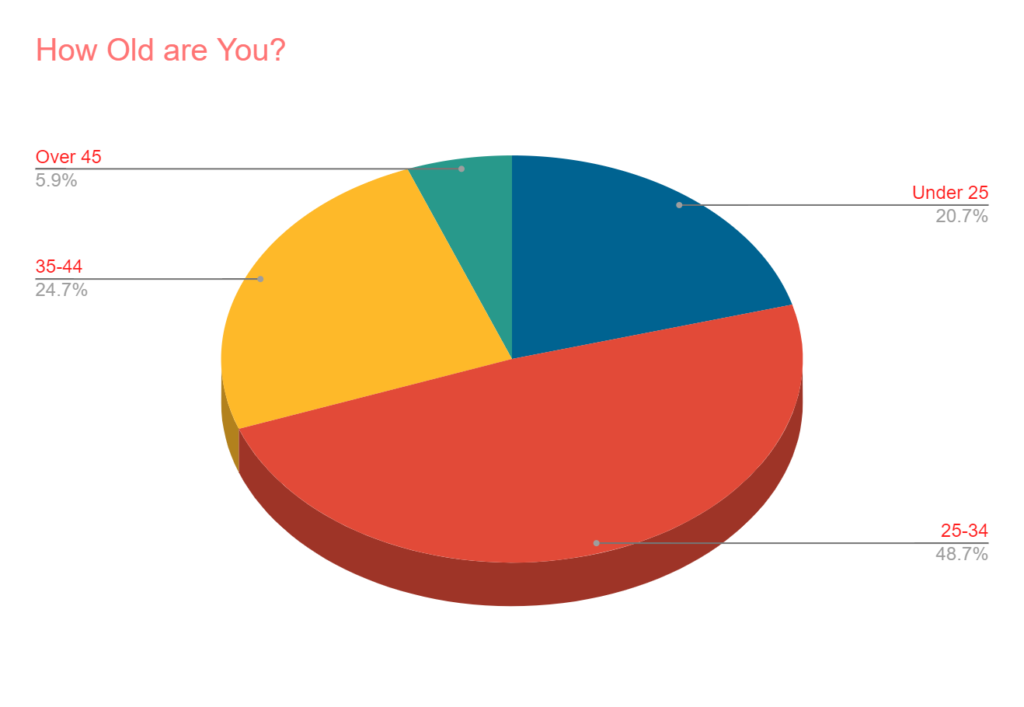 - 94% are under the age of 45. The largest age group was between 25 and 34 who make up nearly 49% of all respondents.