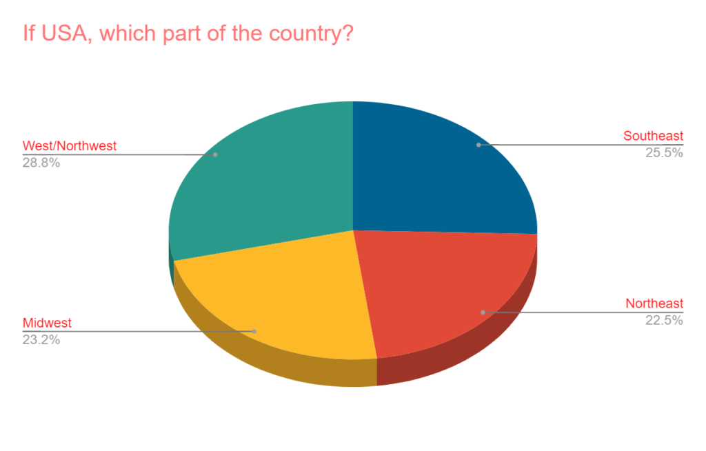 - Within the USA, it’s very much spread out. About 48% would identify as being in the eastern part of the country though.