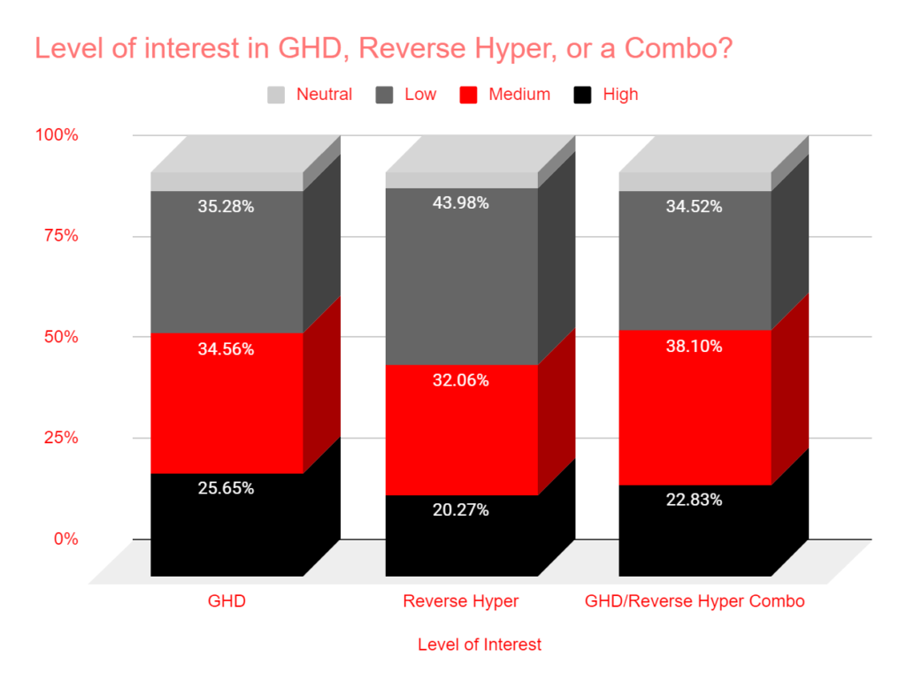 • The GHD was the winner here, but it only received 26% “high” votes. Therefore, none of these had a ton of interest in having this in their home gym.