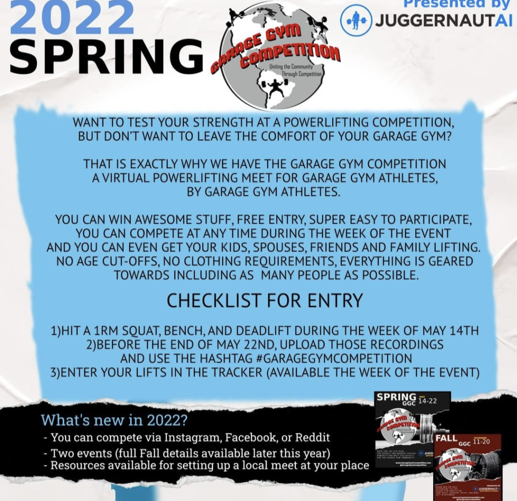 In February 2018, Joe had this idea of a virtual powerlifting meet and reached out to a few others within the space at the time to see if they wanted to get involved (@garagegymlab, @garagegymexperiment, @garagegymscom). All of them & his wife, who was used as a sounding board, thought it was a good idea. Therefore, he proceeded! A few months later, the first Garage Gym Competition happened.
