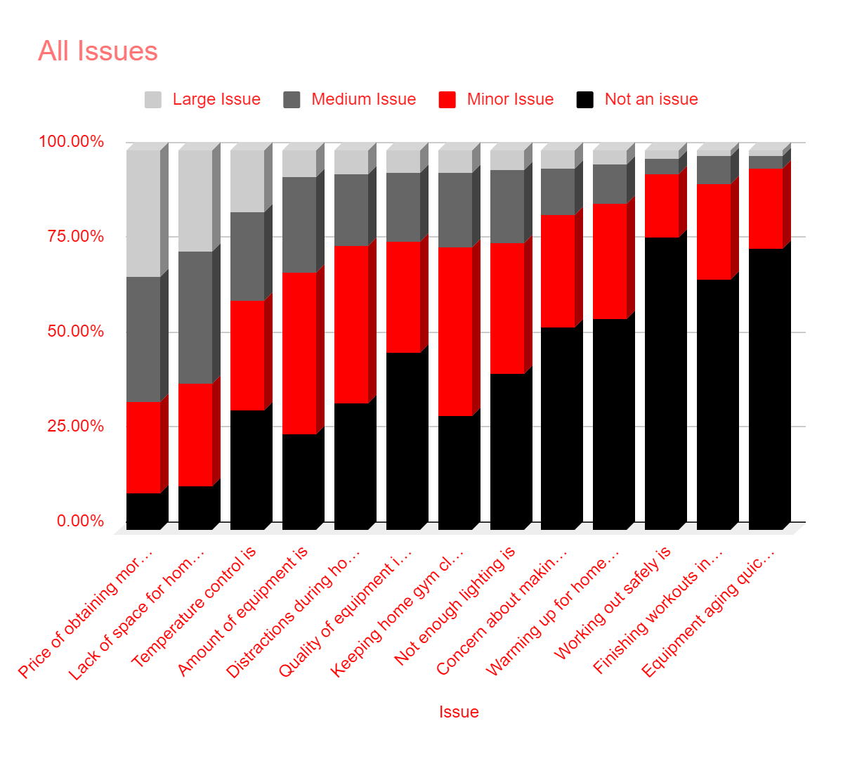 - Amount of equipment, keeping the home gym clean, and distractions were deemed “medium issues.”