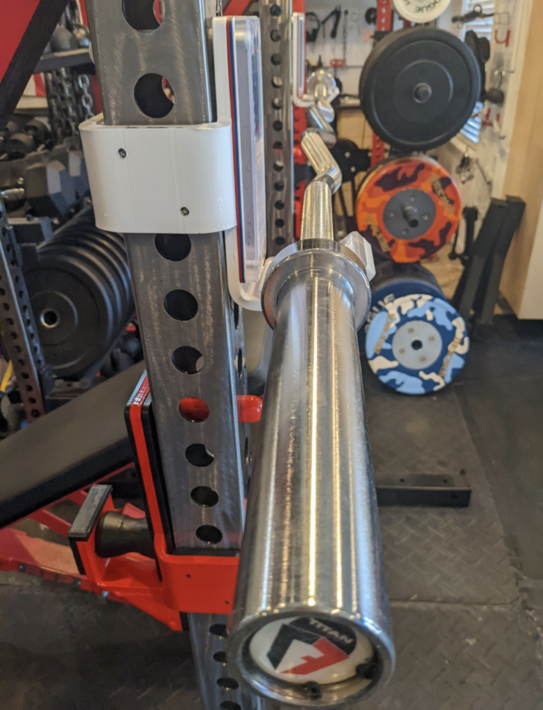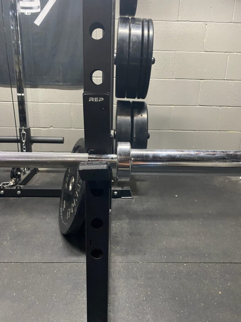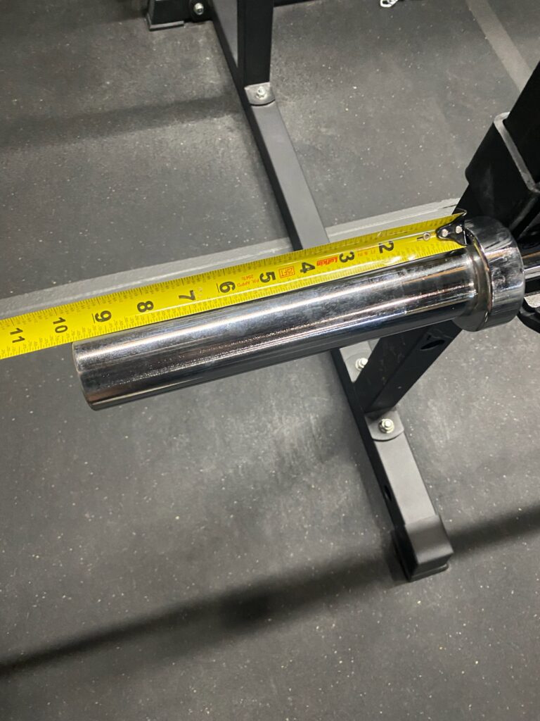 In between the sleeves, the bar is 49.25″ long. When it is loaded on your rack, there is not a ton of extra room for clearance. Traditionally, Olympic barbells will have over 51″ of clearance between sleeves. This bar fits the rack a little too snug. You can find yourself banging into the uprights when reracking.