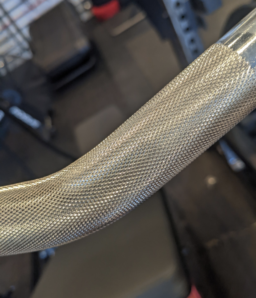 This bar is chrome finished, and that’s the biggest knock on it. Chrome is a cheaper finish and usually leads to an almost ‘slippery’ feeling knurl. The knurl on this bar is particularly pretty good for a chrome bar. Just to repeat, it is good compared to other chrome knurling. To be clear, it is not good if you are a stickler for knurling. Tan