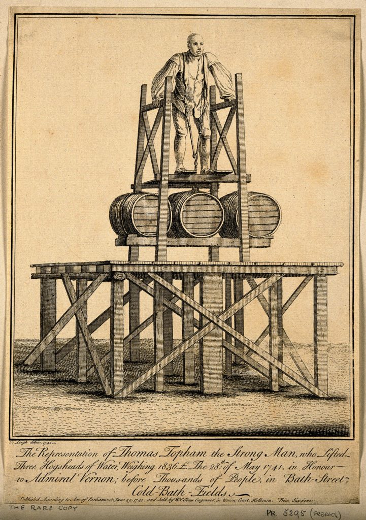 V0007279 Thomas Topham, lifting 1836 lbs. Etching by C. Leigh, 1741, Credit: Wellcome Library, London. Wellcome Images images@wellcome.ac.uk http://wellcomeimages.org Thomas Topham, lifting 1836 lbs. Etching by C. Leigh, 1741, after W.H. Toms. 1741 after: William Henry Toms and C. LeighPublished: 29 June 1741 Copyrighted work available under Creative Commons Attribution only licence CC BY 4.0 http://creativecommons.org/licenses/by/4.0/