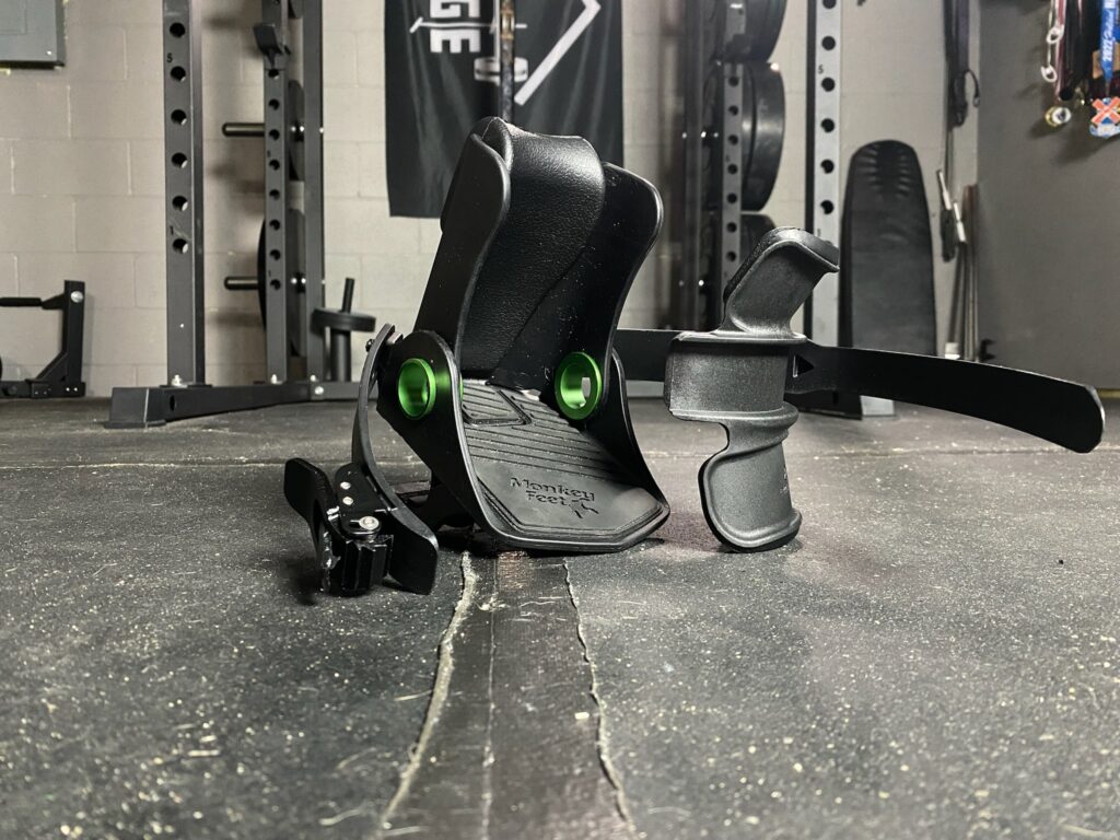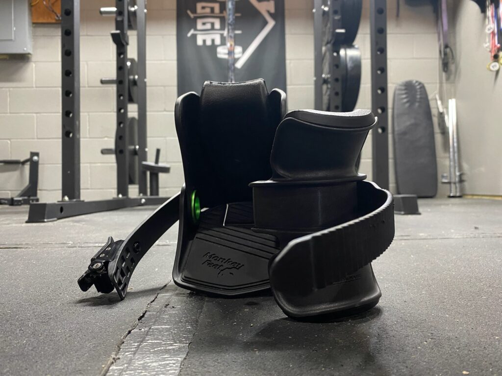 The design of the Monkey Feet is relatively simple. If you were to describe it to someone who has never seen it, you wouldn’t be far off to say that it is a snowboard binding with a clamp for dumbbells on the heel.