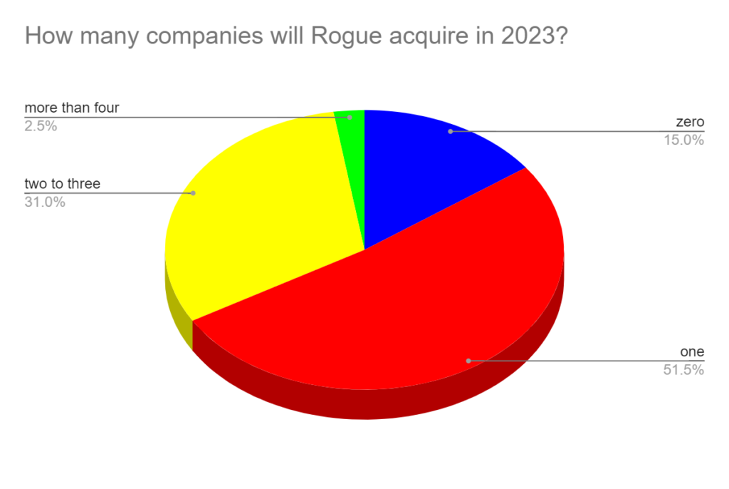 - 52% believe Rogue will acquire one company next year. Only 15% believe zero.