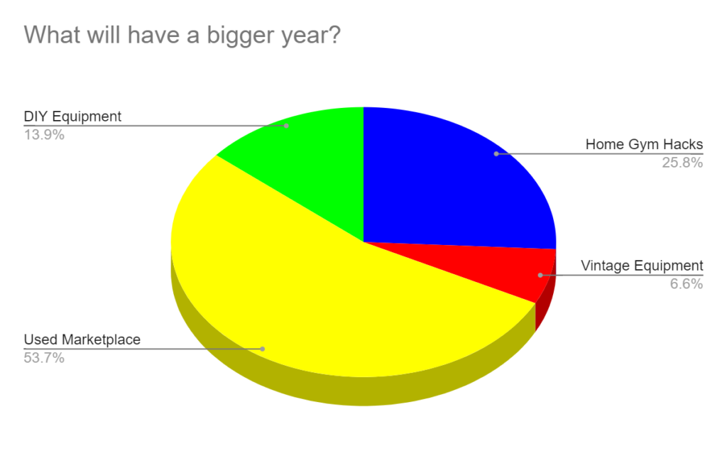 - With gym equipment prices up, 54% say that the used marketplace will have a bigger year than home gym hacks, DIY equipment, and vintage weights.