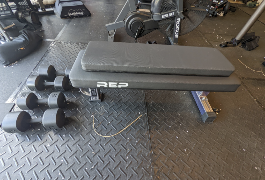The REP FB 5000 is their competition-style flat bench. Using the tripod design, it comes with a standard or wide pad option with a handle in the front and wheels in the back to make it easy to move around your gym. For $270, this would be an ideal flat bench for your space.