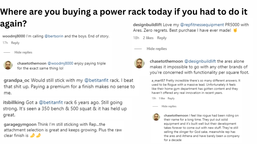Being involved with CrossFit since 2014 Rogue is the only name I knew of. So when I put together my home CrossFit gym rogue was my choice. I went with the rogue monster I paid extra for the red and added all the upgrades. Honestly I didn’t know about bells of steel or Rep fitness. My only complaint with rogue is there prices and what they charge for shipping is crazy.