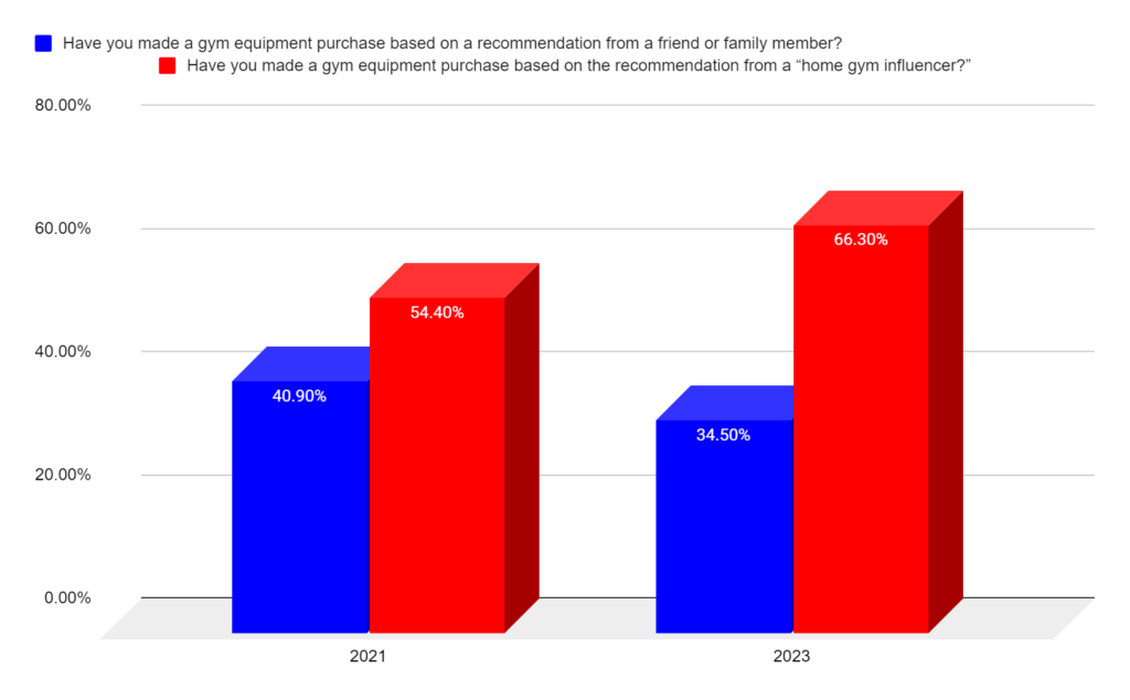 66% have made a purchase based on a recommendation from a home gym influencer & 35% have made a purchase based on a recommendation from a friend or family member.