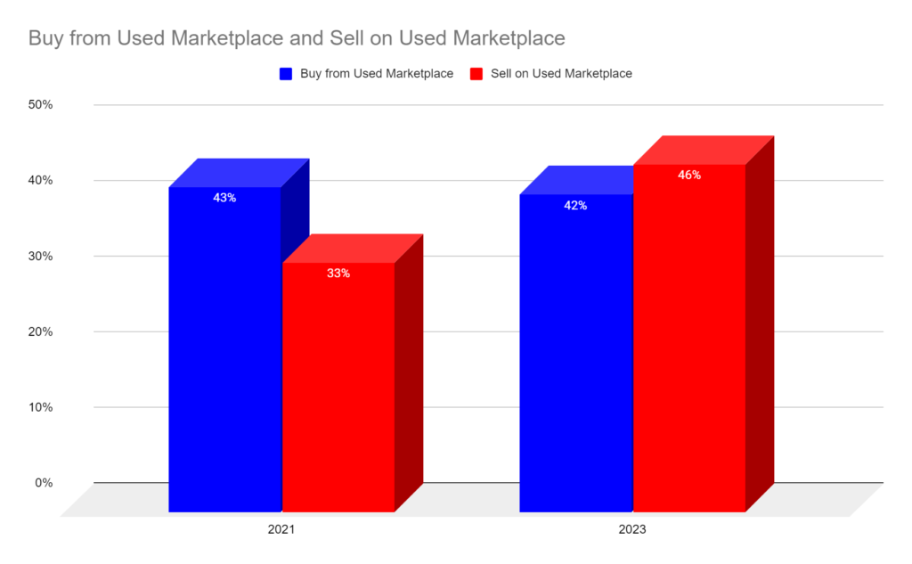 Less have bought, but quite a bit more have sold on used marketplace in 2023 than 2021.