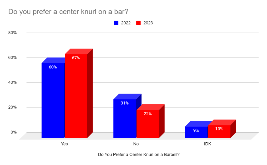 67% prefer their primary barbell to have a center knurl on it. That is up 12% from last year.