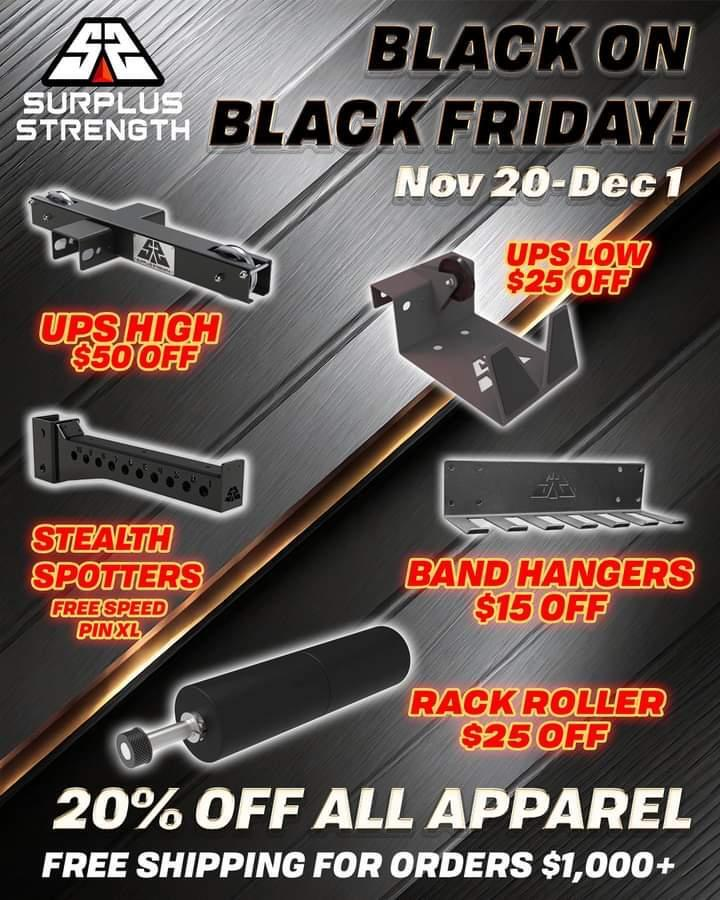 - Matte Black November from Rogue includes some Hot Deals that will randomly pop up (like Monster Power Racks), Hundo Pricing, 5 items Shipped for $5, and $75 Max Shipping with Power Rack purchase.