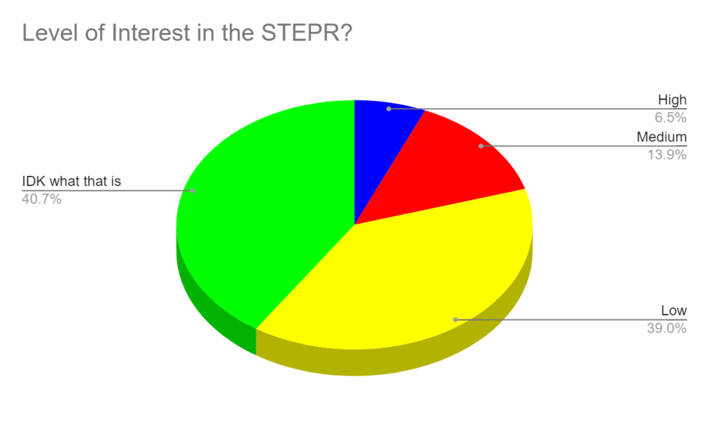The most popular response was “IDK what that is,” with 41% of the votes & 39% voted low interest (likely because of price). About 6.5% have high interest in the STEPR today.