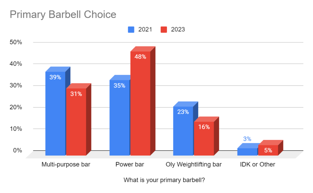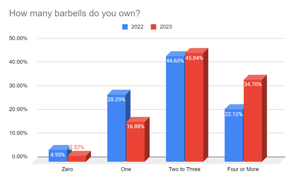 • The amount of those owning multiple barbells is on the rise. Last year, 67% said they owned multiple barbells, but this year, that number rose to 81% (reasons to own multiple barbells).