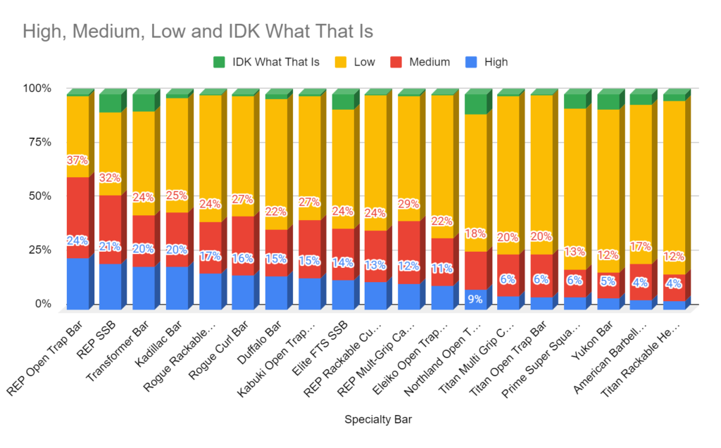 • According to the data, the REP Open Trap Bar is the most popular Specialty Barbell out there, with the REP SSB closely behind it.