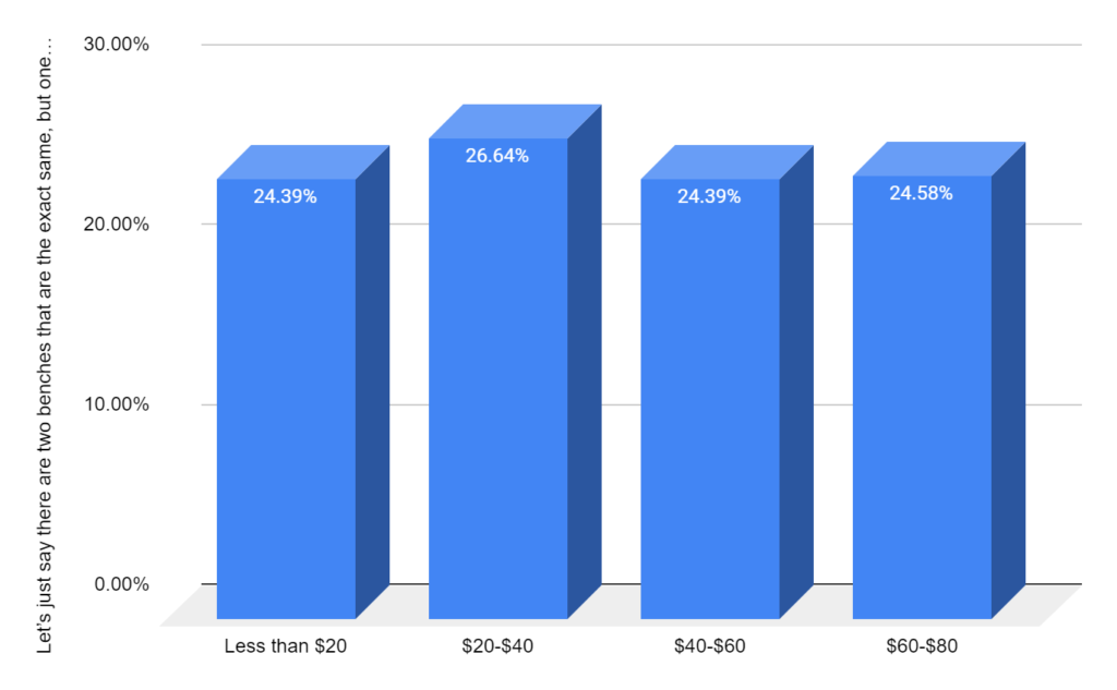 The results are below for when asked: “Let’s just say there are two benches that are the exact same, but one is made in America, but the other is not. How much more are you willing to pay for the one made in America (or whatever country you are from)? The starting price is $200.”