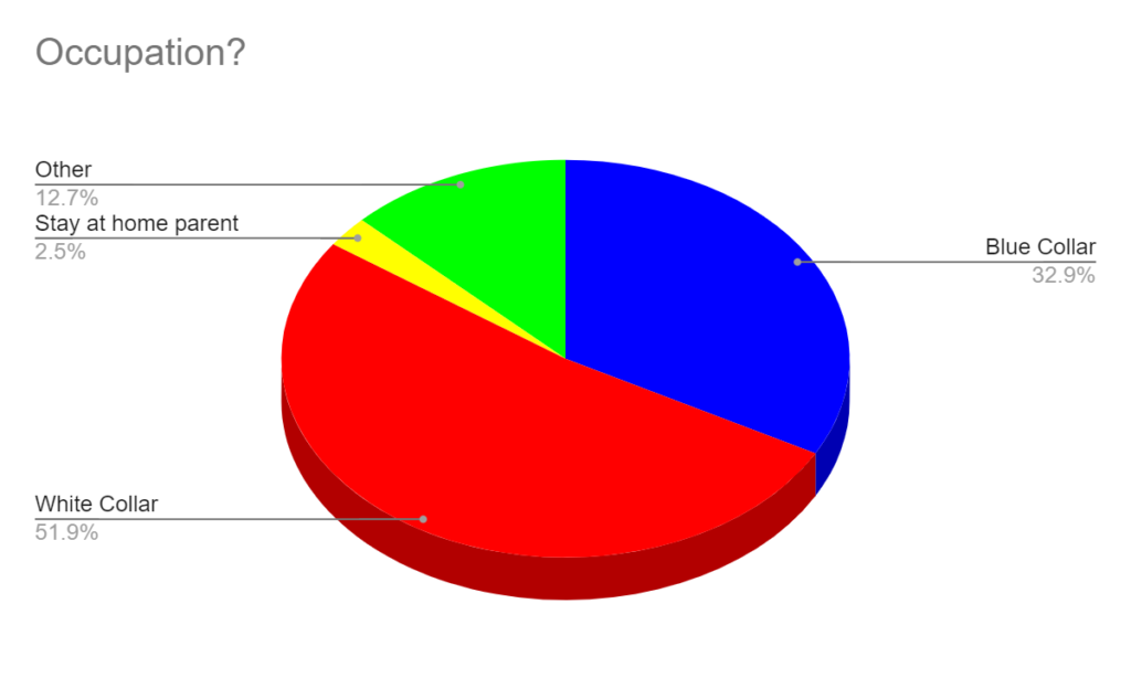 About half answering these questions say their occupation is “White Collar.”