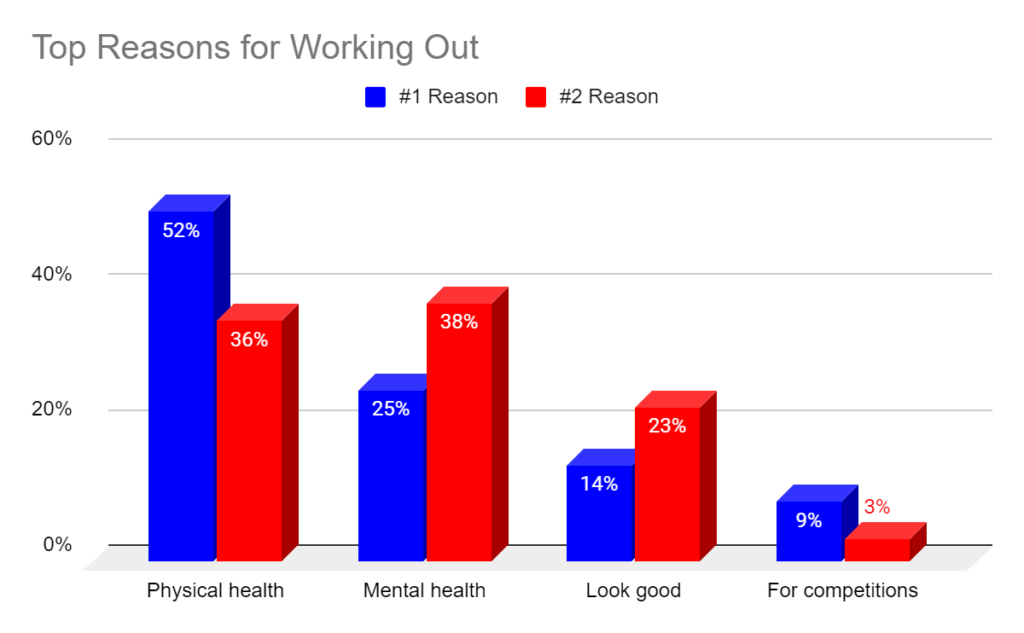 As expected, physical health is the top reason people work out, but mental health is a relatively close #2 reason. Both are greatly ahead of “look good” and “for competitions.”