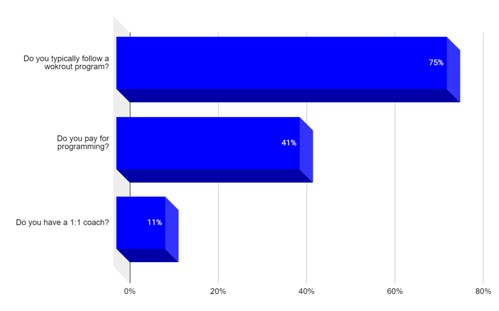 75% typically follow a workout program, 41% pay for programming, and 11% have a 1:1 coach.