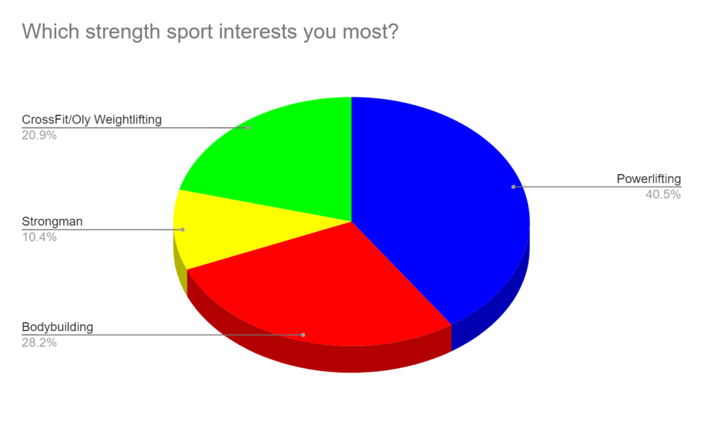 Powerlifting is the strength sport of choice for about 41%.