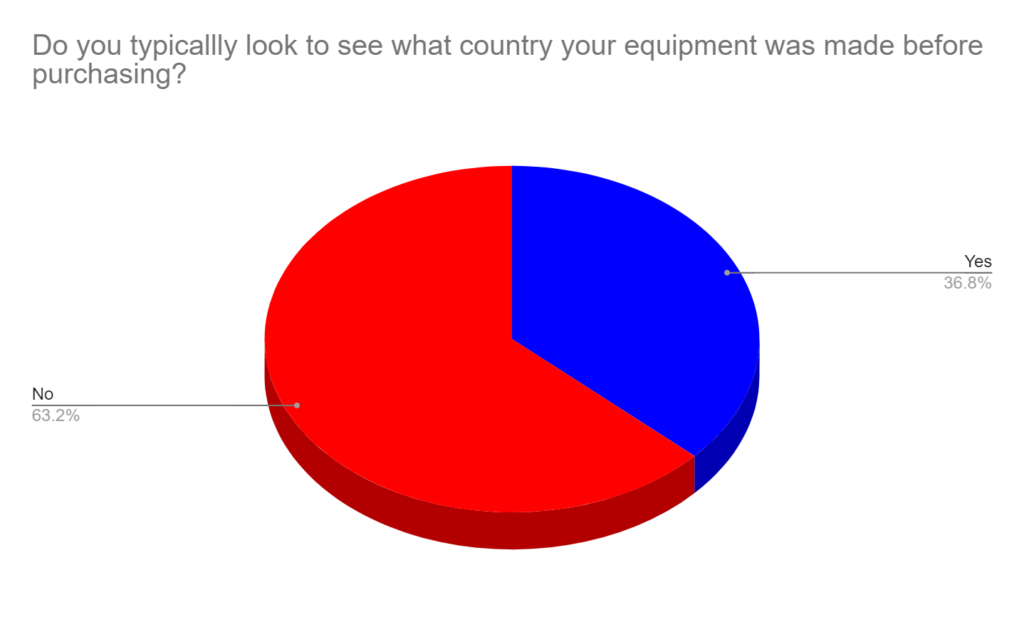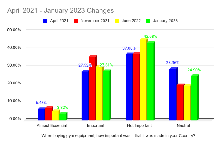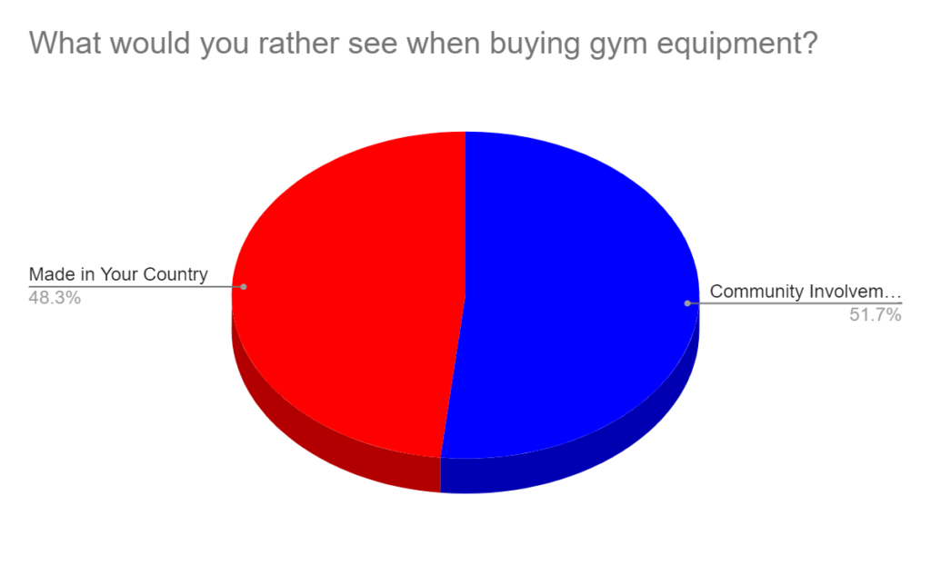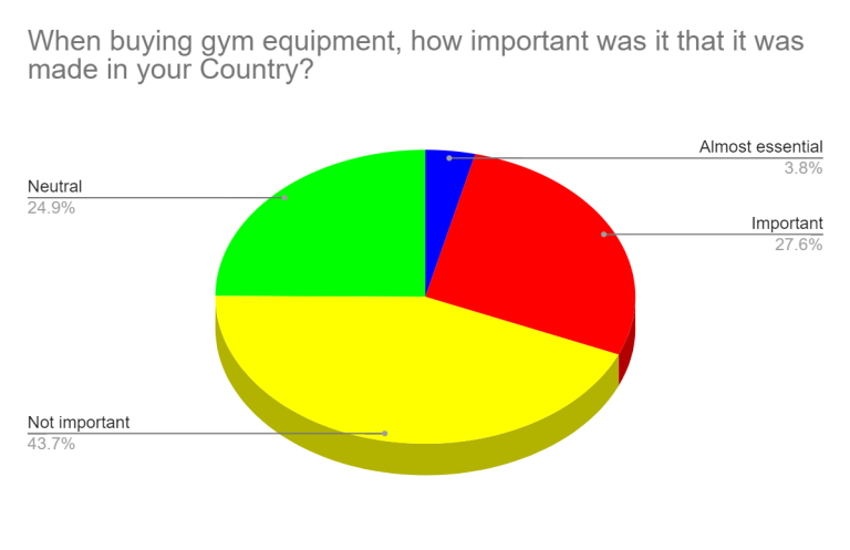 69% vote “Neutral” or “Not Important” when asked about the importance of buying gym equipment made in your Country. 28% said buying gym equipment made in their country was important to them, but only 4% voted “almost essential.” The 44% “Not Important” votes were greater than those two combined. About 25% voted “neutral.”