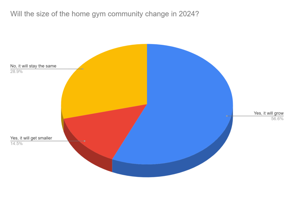 Nearly 3/5 believe that the size of the home gym community will grow in 2024. Less than 15% believe it will get smaller.