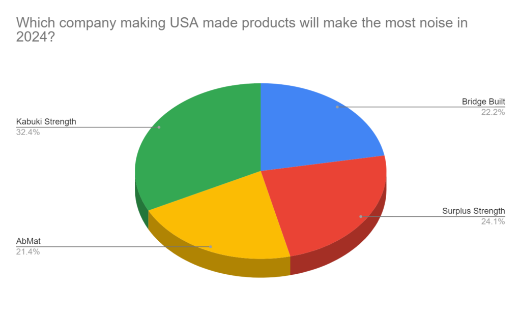 When asked, “Which company making USA-made products will make the most noise in 2024?” Kabuki Strength beats out Bridge Built, Surplus Strength, and AbMat.