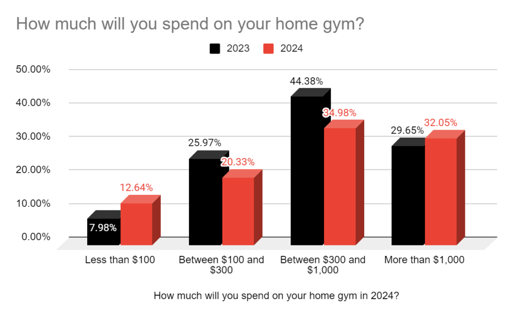 Outlook for spending on Home Gym is Less than 2023. Nevertheless, 32% still believe they will spend more than $1,000 on their home gym in 2024.
