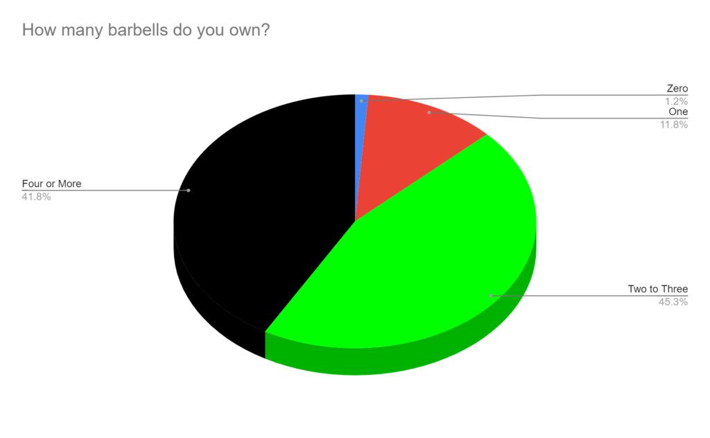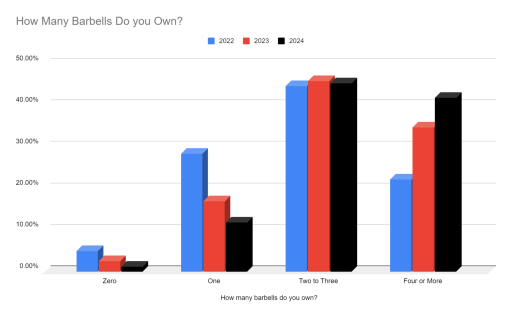 This is the third year in a row we’ve asked how many barbells you own. A whopping 87% own multiple!