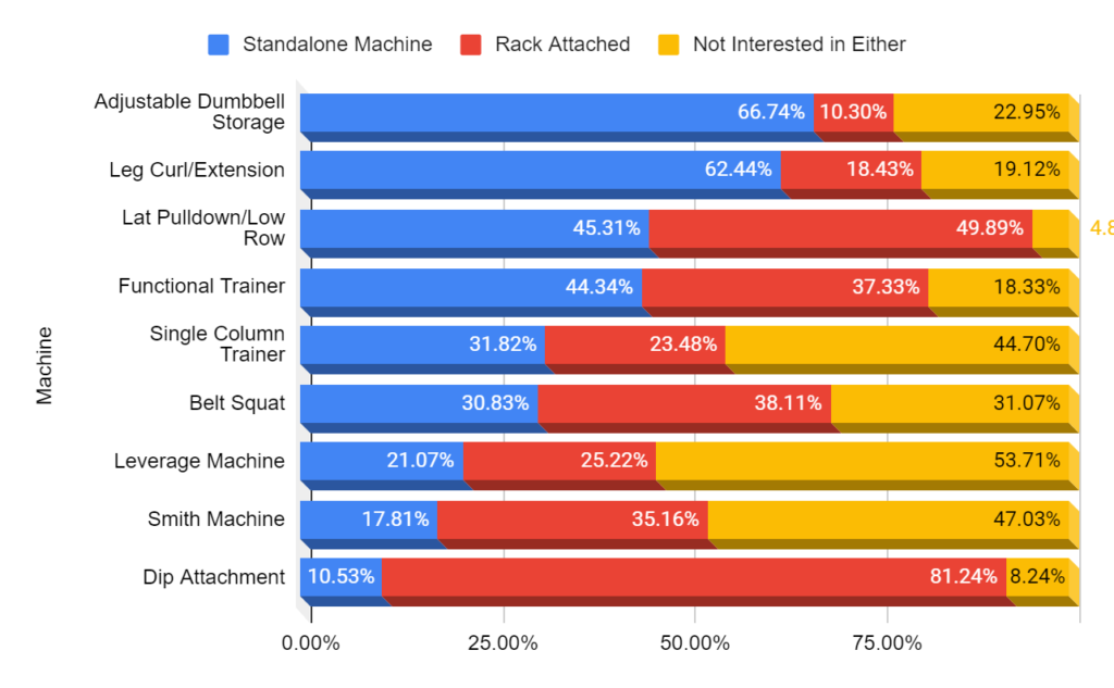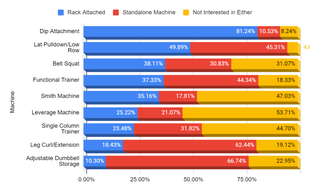 This leads us to our survey results, where the community was asked whether they would prefer to add individual pieces to their gym as a rack attachment or standalone machine.
