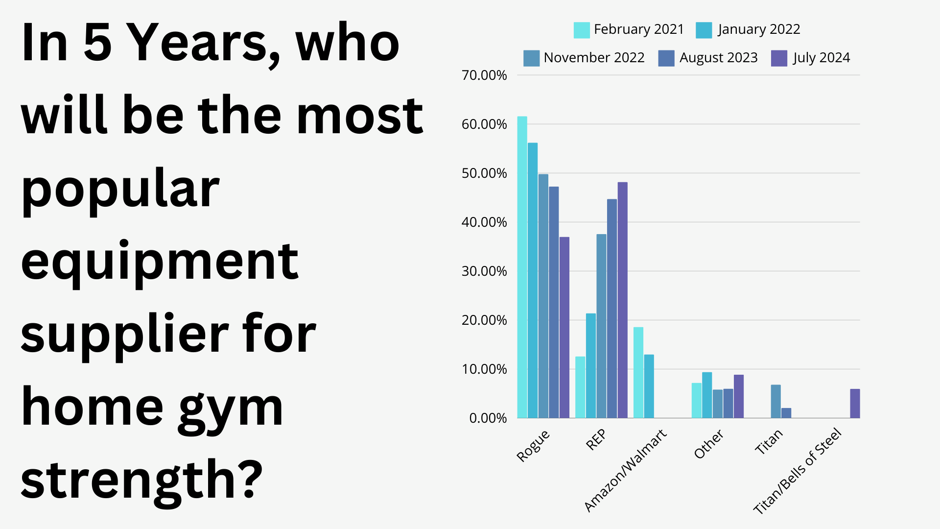 Since February 2021 (just after the pandemic rise), we’ve asked, “In 5 Years, who will be the most popular equipment supplier for home gym strength?” on a pretty regular basis.