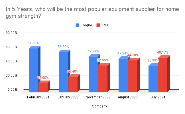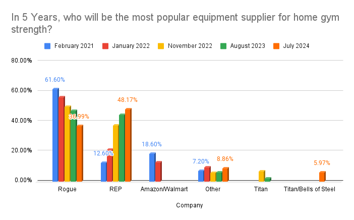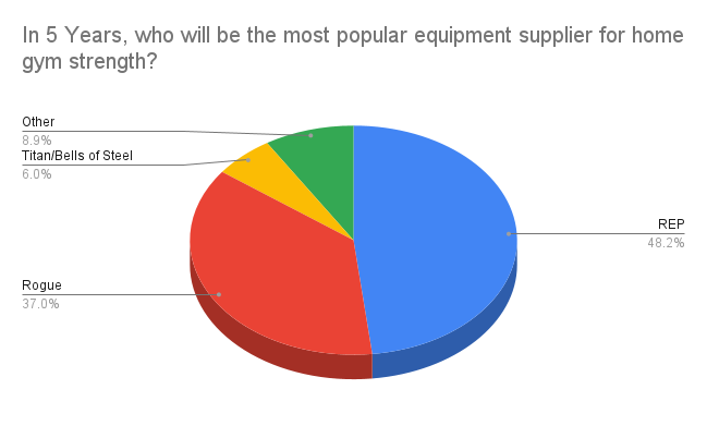 In the end, there are two companies pretty clearly at the top, but there has definitely been a shift in the outlook for “who will be the most popular equipment supplier for home gym strength in 5 years.”