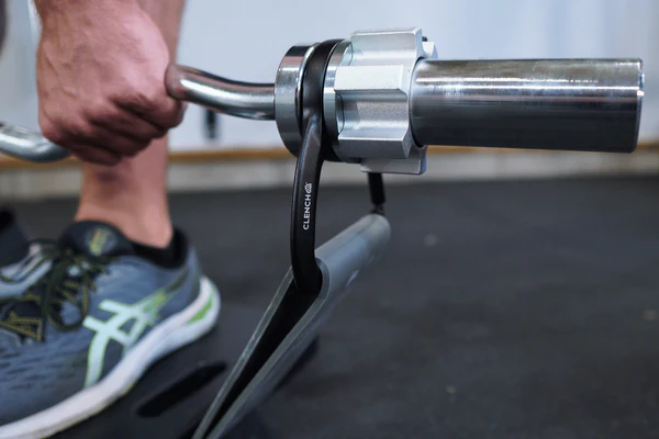 This new tool from Clench allows users to transform an Olympic-style barbell into a resistance band bar by sliding the hook onto the end, adding a barbell clamp, and attaching a resistance band to the Carabiner.