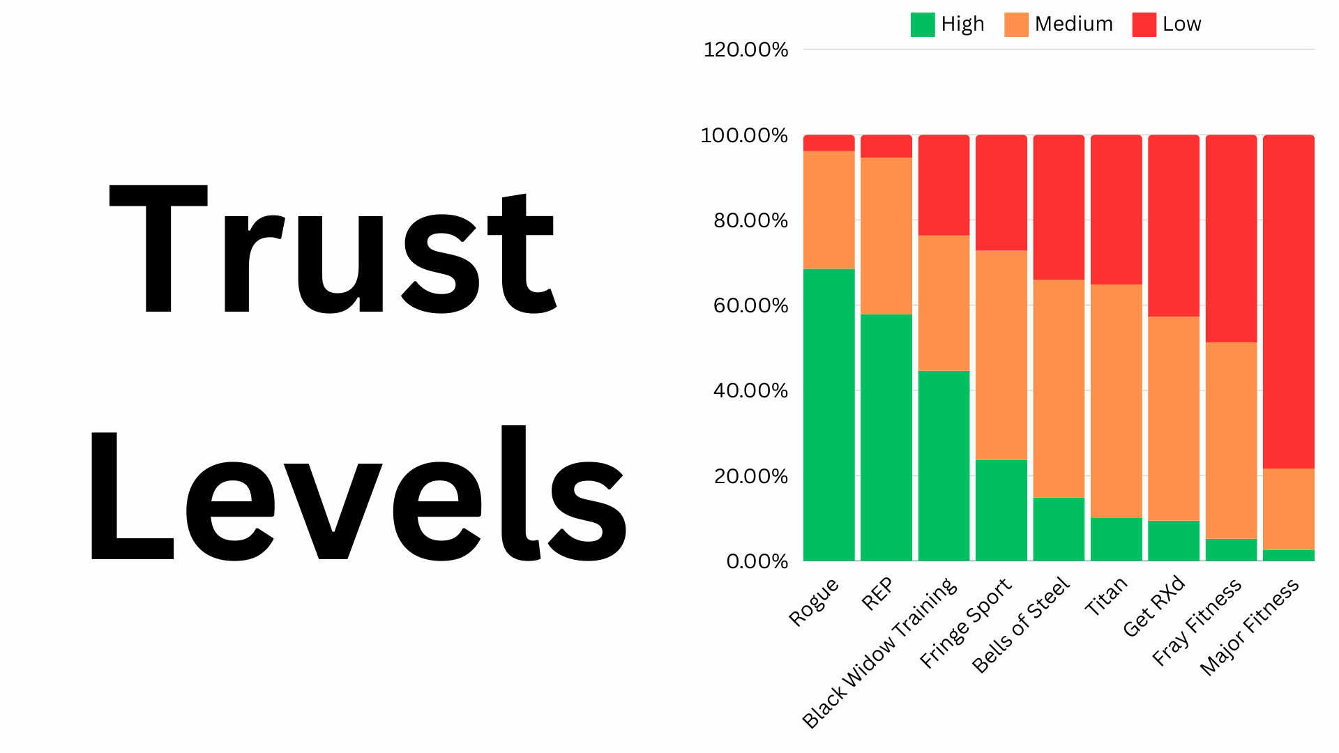 - Fray Fitness: Low trust, with nearly half (48.70%) rating it “Low.”