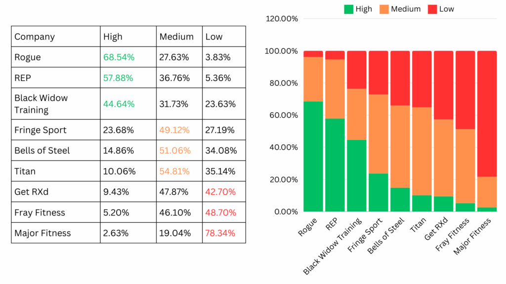 In the past, we simply polled Rogue, REP, Titan, and Amazon, but switched up the company list this year to – Rogue, REP, Titan, Bells of Steel, Fringe Sport, Get RXd, Black Widow Training, Major Fitness, and Fray Fitness.