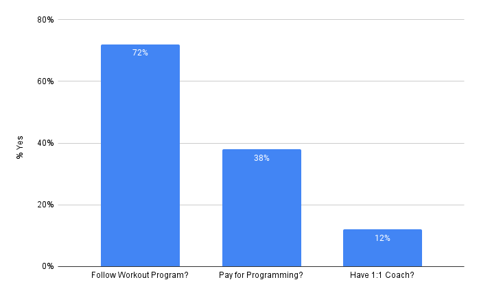 - 72% typically follow a workout program, 38% pay for programming, and 12% have a 1:1 coach.