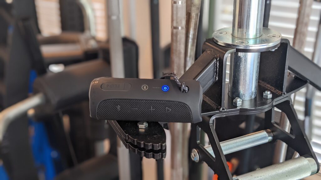 In a home gym, not only do you get to choose what’s being played but also the volume! For its size, this speaker packs a nice punch! For example, you’ll have no issues continuing to listen to music while on the windy Echo Bike. The bass isn’t too intense, so it will need to be a full blast to get the neighbor’s attention. There are no issues of crackling or diminishing clearness as the volume raises.
