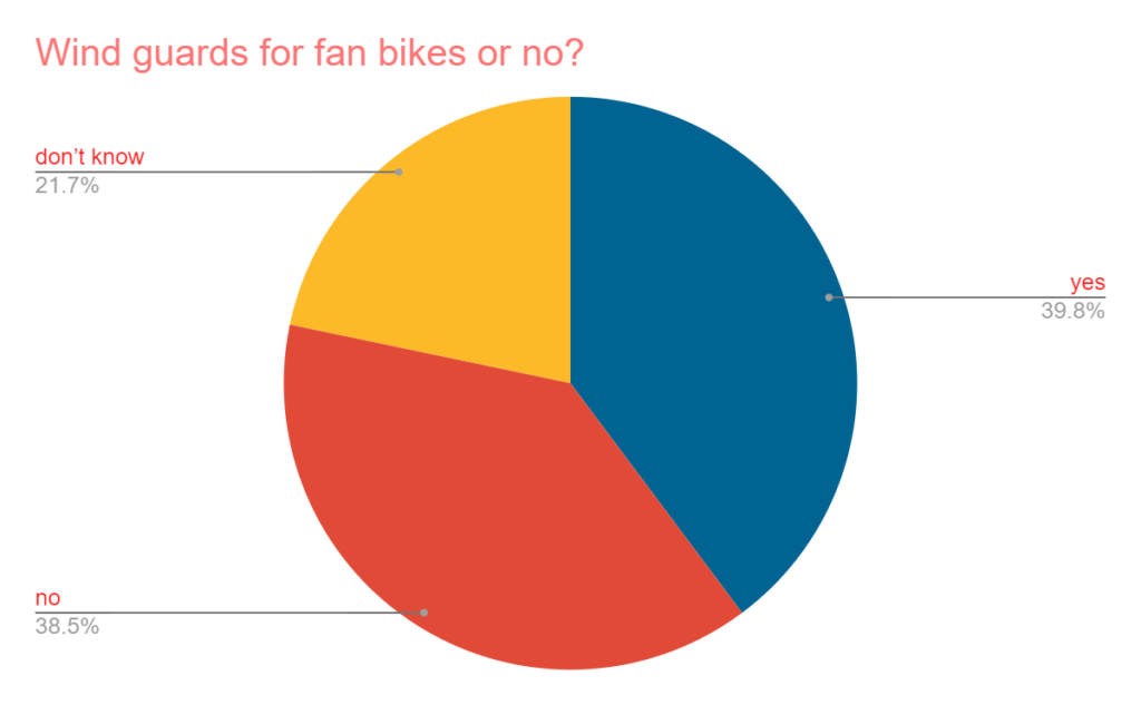 - Wind guards for fan bikes or no?? While 22% say they don’t know, there were slightly more voters for the wind guards than not.